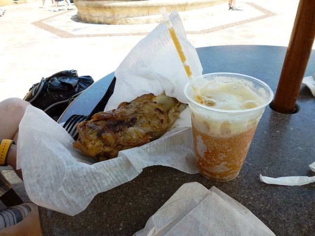 ローストポークと泡のついたフローズン・アップルジュースを注文しました。アップルジュースは専門のカップ付きも買えましたが結構な値段でしたので、ジュースだけにしました。肉は少し油っぽく、お茶と塩がほしくなりますが、ジューシーで大満足。ジュースも冷たくて最高。ビールみたいで楽しいし雰囲気たっぷりのいい写真が撮れます。