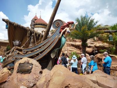 リトルマーメードのアトラクションです。ファストパスを取れるのがこれしかなかったので、一応取って行きましたが、取らなくても待たずに乗れそうでした。ピンクの貝に乗って行くアトラクションです。アリエルを知っている女の子は好きそうです。