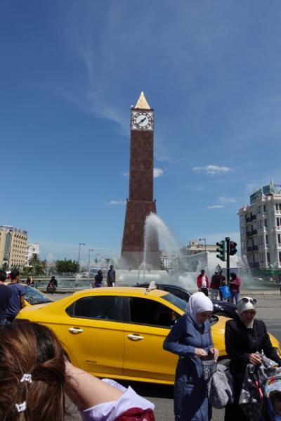 次の目的地はカルタゴ遺跡。ホテルを出て右に向かうと時計塔がある。道路に...