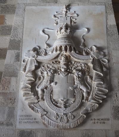 博物館部分の展示物の解説はありますが、館内施設・物品の解説がほとんどありません。館の中で目立っているのは、周辺のギリシャローマ遺跡から集めたと思われる、モザイク・石柱・彫像と、暖炉の上のヴィットーリオ・エマヌエーレ3世(イタリア王)の大きな紋章です。この紋章は、第一次大戦後のイタリア領時代に大幅に修復(改修?)したときに付け加えられたと思われます。結果として、どこが(どこまでが)、騎士団時代の姿なのかが判らなくなっています。