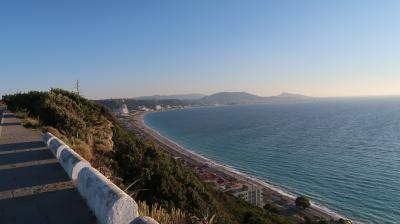 ロドス島の北部で最も標高が高いのは、スミス山もある、島の西海岸の断崖の上です。そこを通るイシオドゥ通りからは、遮るものなく、西にエーゲ海、東に地中海を眺めることが出来ます、特に夕方。但し、タクシー等を使わないと、旧市街から登りを30分以上歩いていく必要があります。遺跡は特段のものではありません。