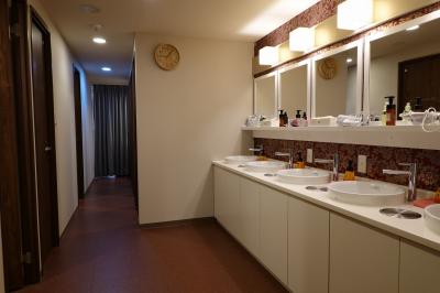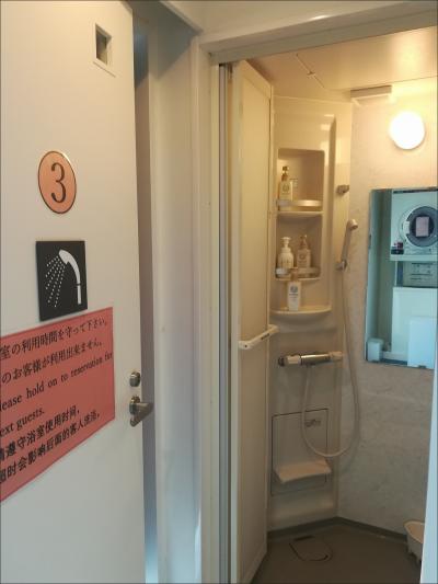 共同の洗面所、トイレ、シャワーは同フロアにあり、シャワーは3ブースしかありませんが、そのうちの1ブースは小さなバスタブもついています。シャワーは特に予約制ではなく、空いていれば24時間いつでも好きな時に使ってよいとのことで、スタッフもこまめに清掃に入ってくれているようなのできれいに保たれており快適でした。バスタオルと歯ブラシはロッカーに備え付けのものがありますが、フェイスタオルはありませんので必要であれば持参をおすすめします。その他、今回は行っていませんが上階のほうにはキッチンや冷蔵庫、イートインスペースなどもあるようです。