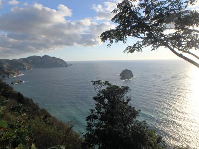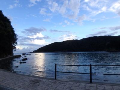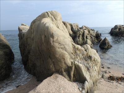 海水浴場からさらにビーチを西に進むと、海蝕された巨大な奇岩がゴロゴロしていてちょっと面白い景観が広がっています。さらに西に進むと県の天然記念物の屏風岩もあります(私はこれを見そびれました)。海水の透明度は高くて岩場で磯釣りをする地元の方もいらっしゃいました。夏の夜には満天の星空と海にかかる天の川が見渡せるそうです。