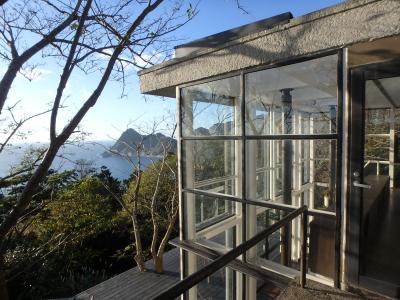 Hamabe Ouraは、セミデタッチドハウスタイプの「兜(A, B)」と、2階まで吹き抜けの「風車」の2つの住宅から成り、湾を一望できるプライベート(共用)プールがあります。2つの建物合わせて最大で8名まで宿泊できるそうです。どちらの建物も日本の「折り紙」にインスピレーションを得たという大変に美しいデザイナーズ建築です。今回は「風車」に宿泊しましたが、天然の木材をふんだんに用い、随所に遊び心のある美しく楽しいデザインには、滞在中ずっと癒され、最高に贅沢な気分にさせていただきました。伊豆急下田駅の近くにある東急ストアで食材を買って自炊しましたが、キッチンやバスルームも広々で使い勝手よく、大変快適に過ごせました。