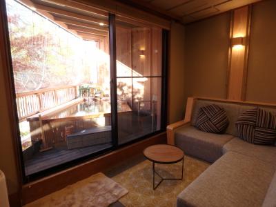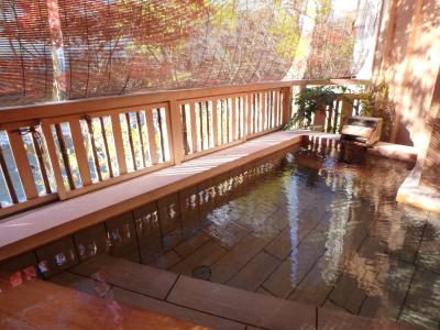 そして何と言ってもお部屋の檜露天風呂のデザインや雰囲気が素晴らしく、作りもゆったりとしていて大人2人で入ってもじゅうぶんなスペース。お湯の温度も熱すぎずぬるすぎず、いつまでも入っていられて、眼下に流れる利根川のせせらぎや鳥たちの声に耳を傾けながら、西陽に輝く紅葉を眺めて至福の時間を過ごせました。