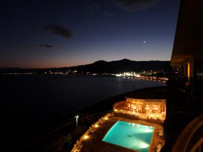 眼下には、このホテル自慢の素敵なプールとレストランも見下ろすことができ、夜もライトアップされたプールとガラス張りの煌めくレストランの建物、そして晴れていれば熱海や伊豆半島方面の夜景と星空を、打ち寄せる波音に耳を傾けながら一晩中でも楽しめます。温泉はありませんが、1階にジャグジースパ(リフレッシュルーム)があり、水着着用で楽しむことができます。また、雰囲気の素敵なバーも1階にあります。