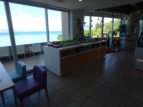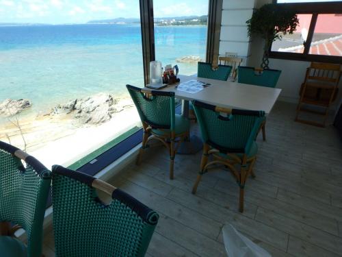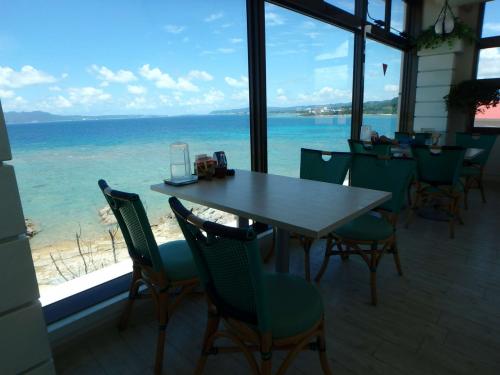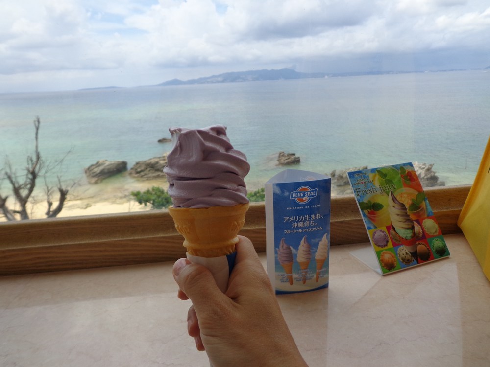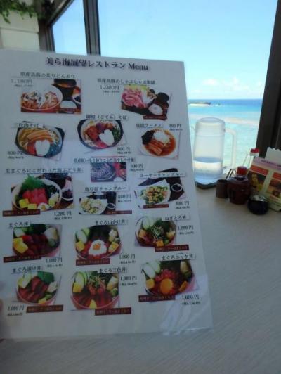 ここの売りは、そのカジュアルで入りやすい雰囲気に加え、大きな窓からの、美しいダイヤモンドビーチの絶景です。これを見るためだけにでも、ドライブの休憩に立ち寄る価値ありと私は思います。海の眺望は、ここのレストランを利用しなくても、御菓子御殿やその隣の別館からでも望めるのですが、まあ、ある程度おなかが空いていて、沖縄そばとか海鮮丼とか、そういったものが食べたいようであれば、このレストランの利用をお薦めします。