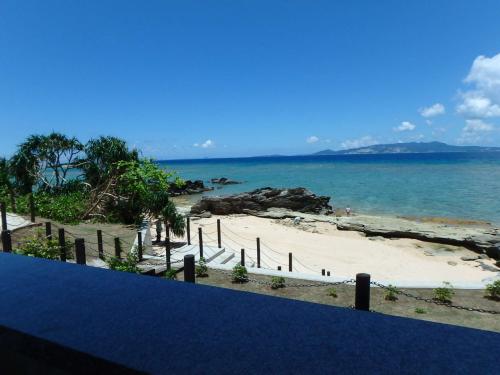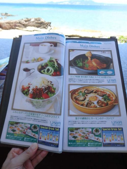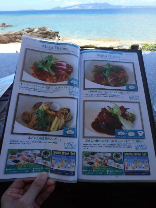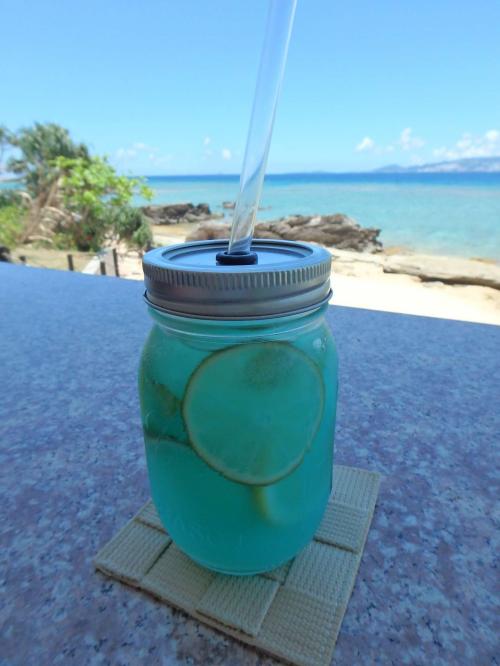 ここのお店は何といっても、窓から目の前の美しいダイヤモンドビーチが一望できるのが売りです。お店からビーチに出て行くこともできます。店内のテーブルを利用するのもいいと思いますが、外の海に面したテラス席なら、サンゴの砂浜とブルーの海、その向こうに広がる本部半島や伊江島などを眺めわたせるので、お天気が良ければぜひテラス席をおすすめしたいです。テラスと言っても、石造りの簡素なものですが、眺望は素晴らしいです。