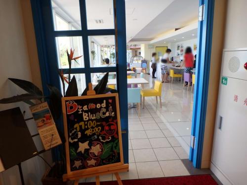 - パステルブルーの爽やかで可愛い店内。こじんまりして落ち着きます。そして何といってもテラスの目の前はダイヤモンドブルーの海!