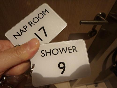 NAP ROOMとシャワールームの鍵は、それぞれ別々なので、シャワーを使いたい時にはフロントに声をかけ、その時に空いているところの鍵を借ります。シャワールーム内にはトイレと洗面所もあり、とても清潔でシンプル&スタイリッシュです。バスタオル1枚と、リンスインシャンプー、ボディーソープ、ドライヤーもあります。お湯を長いこと出しっぱなしにしていると湯温が下がってきてしまうことと、室内の換気があまり良くなくてドライヤーをする時にちょっと汗かいてしまったことを除けば、とても気持ち良く使えました。