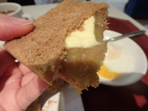 私にとってはこちらのお店が、人生初カヤトーストでした!カリカリサクサクに焼けたブラウントーストの間に、たっぷりのバターとカヤジャム!カヤジャムは甘いですが、バターの塩分も同時に口の中に広がり、トーストの香ばしい香りと相まって、それはそれはもう贅沢でシアワセな朝食のひとときでした!(≧∇≦)