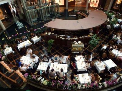 マリーナベイサンズのショッピングアーケードを歩いていれば、必ず目にとまるのがこちらのお店です。吹き抜けのウォーターガーデンの上に、弧を描く形でテーブルが配置されています。アーケードの中にはもう一店舗、サンパン舟の通る運河の上にもありますが、最初に見たのがこちらのほうだったので、こちらのお店に入ってみました。
