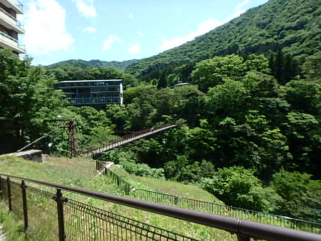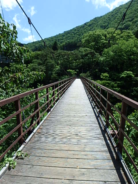 宿泊していたあさやホテルから歩いて行きました。ゆっくり歩いても10分弱で辿り着けます。滝見公園という、きれいに整備はされていますが特に何の変哲もないような公園から入って、そこの奥に進むと橋が見えてきます。橋自体は結構な年季が入っていますが、さほど揺れてコワイようなこともありません。しっかりとした橋です。