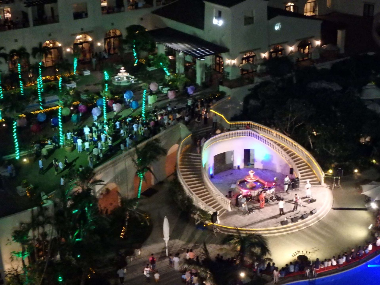 そして何と言っても、土曜日のサタデーナイトフィーバーは必見です!中庭とガーデンプール前で、従業員の方々が制服姿のまま歌って踊ります。もともとは読谷高校にダンス部を創設された先生が生徒たちや仲間を集めて始められたのがきっかけだそうで、歌もダンスもプロ顔負けのレベル、ライブステージも本格的なものです。曲目は80年代のなつかしい曲などが多く、一緒に踊って大フィーバー(?)とても楽しい時間を過ごせました。ここに来るなら、是非土曜日に来てこのライブを見てほしいです。
