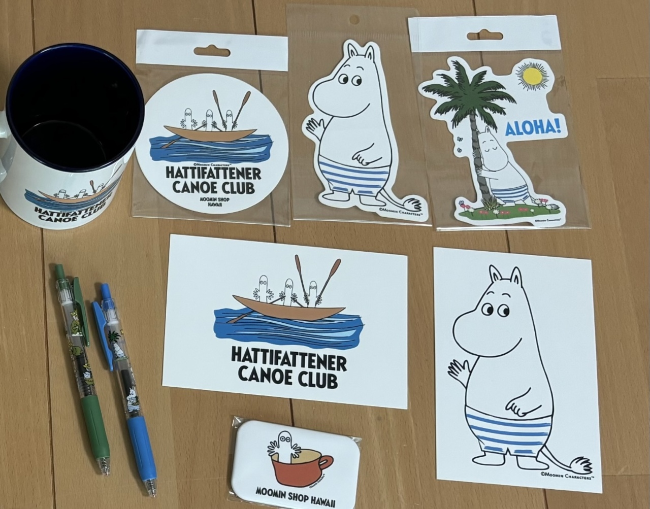 アラモアナセンターの1階中央付近にあります。ハワイ限定ムーミンのグッズがあって、ムーミン好きにはたまらないお店です。楽天クーポンで、50ドル購入するとペンかステッカーが2個貰えました。ペンは好きなものを選ばせてもらえました。