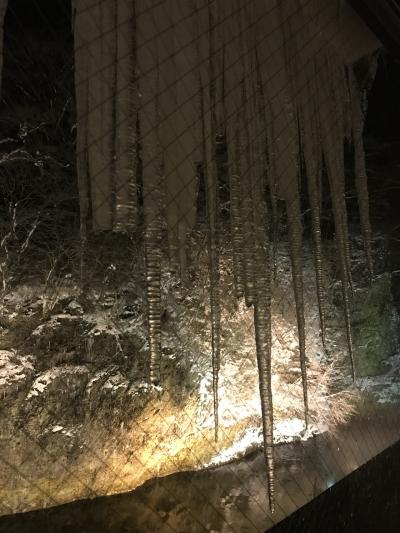 温泉は、目の前の川向こうの崖がライトアップされていて、氷柱や雪が照らされて幻想的でした。洗い場がたくさんあるのも良かったです。