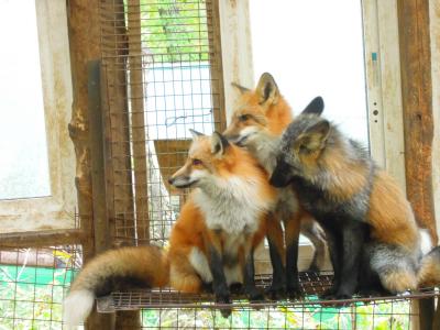 鎖に繋がったキツネや、ゲージに入ったキツネが入ってすぐの所に数匹います。