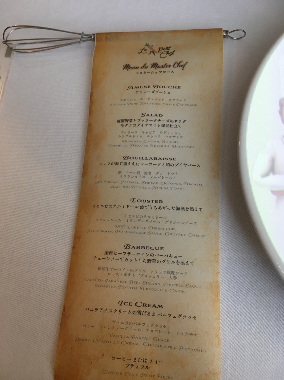 小さな泡立て器にメニューが巻かれていて、テーブルに置いてあるのですが、それは持ち帰ることができます。