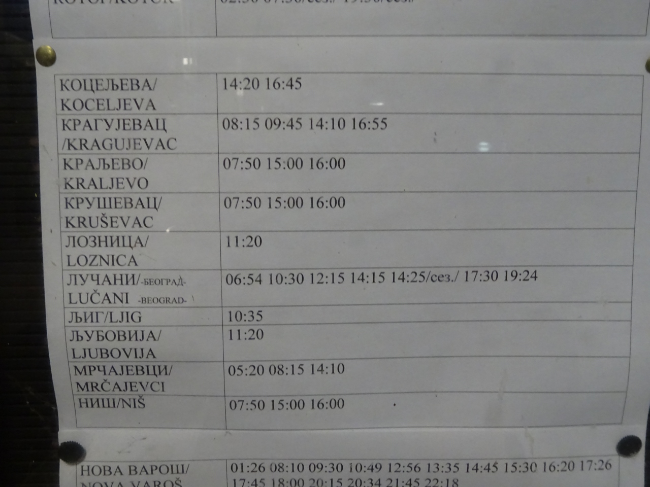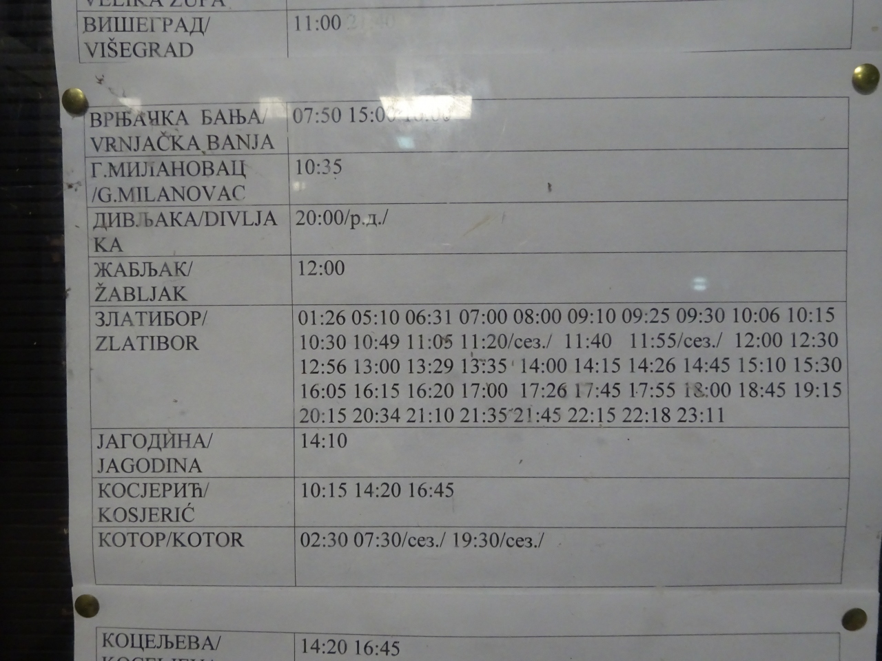 2019年9月に訪れた際の時刻表です。BalkanViator等の時刻表検索で出てくる便は実際には運行されていないことがあるようです。ヴィシェグラードへのバスは11時発のサラエボ行きのみでした。このバスはAromaという会社の運行でPale行きとなっていますが、実際にはサラエボ東バスターミナルまで行きます。サラエボ市街地に入ると渋滞がひどかったです。旧市街へ急ぐ場合はPaleで下車してタクシーか、旧市街の南のPut Mladih Muslimanaという通りを通るので、渋滞にはまっている最中にBistrik地区のあたりで下してもらうのも手かもしれません。