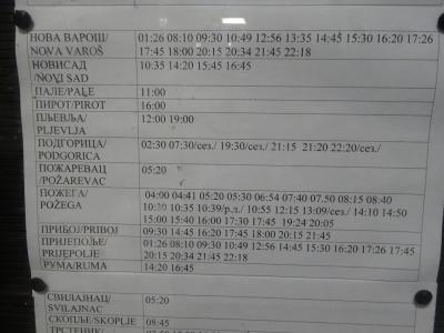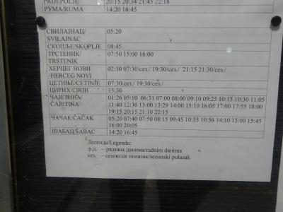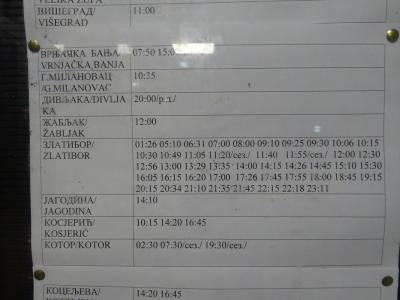 2019年9月に訪れた際の時刻表です。BalkanViator等の時刻表検索で出てくる便は実際には運行されていないことがあるようです。ヴィシェグラードへのバスは11時発のサラエボ行きのみでした。このバスはAromaという会社の運行でPale行きとなっていますが、実際にはサラエボ東バスターミナルまで行きます。サラエボ市街地に入ると渋滞がひどかったです。旧市街へ急ぐ場合はPaleで下車してタクシーか、旧市街の南のPut Mladih Muslimanaという通りを通るので、渋滞にはまっている最中にBistrik地区のあたりで下してもらうのも手かもしれません。