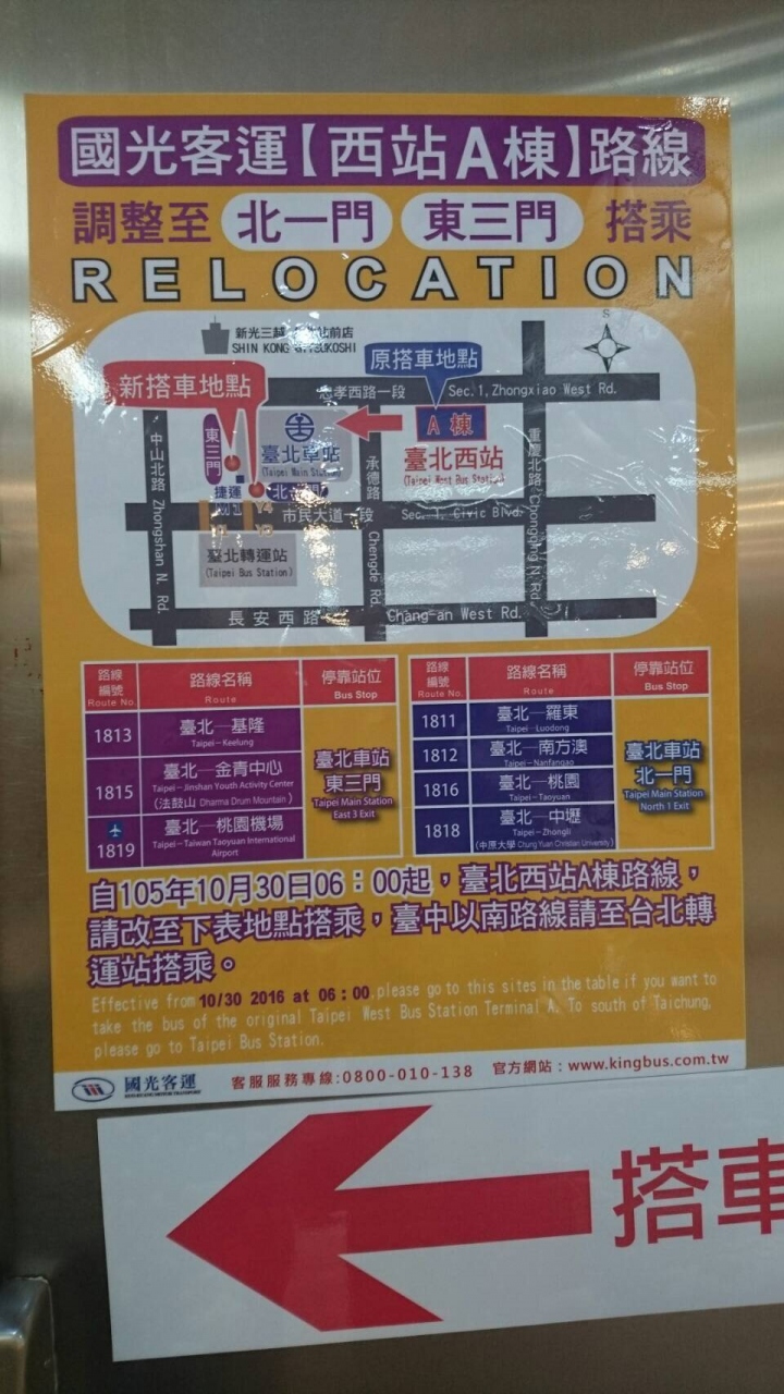 桃園空港行き、台北駅の乗り場が変更になりました。(正確にはバスターミナル閉鎖なので、長距離バス乗り場全体が変更になっています)