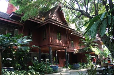 サイアム地区の西、BTSナショナルスタジアム駅から北に歩いて5分、すぐ北側にはセーンセープ運河ボートの船着場があり、プラトゥナムからは5分で着きます。敷地内に足を踏み入れると、茂った木々の中に、実際にジム・トンプソンが住んでいた家屋をはじめ、ショップ、カフェなどが入った伝統家屋が配置されており、周囲の雑然とした雰囲気から隔絶された別世界が広がります。少し待つと、タイ人の女性が日本語でガイドしてくれます。ジム・トンプソンが実際に住んでいた家は撮影禁止なのですが、非常に興味深いものでした。料金は100B(300円)ぜひ時間をつくって行かれることをおすすめします。