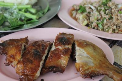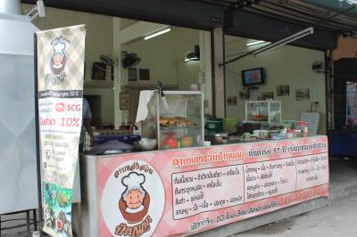以前は中心部にあったのですが、郊外のバンスーに移転しています。地下鉄バンスー駅を背にして5分ほど歩くと高架道路に突き当り、その手前の道を左折し2、3分歩くと左へ入る道があり、そこをさらに2分ほど歩くと食堂が何軒か並んでおり、右側のオープンエアのごく普通の食堂がそれです。看板はタイ語なのでわかりにくいのですが、料理帽をかぶっているおばちゃんのイラスト看板が目印です。昼下がりに行ったので空いていました。名物のガイヤーンは55バーツ(180円)で安すぎです。普通に旨いです。ただ、作り置きを焼き直したためか、驚くほどの感動はありませんでした。その他ソムタム、ヤムヌアなど、イサーン料理は一通りあります。英語のメニューもあります。腹いっぱい食べても1人1000円はいかないでしょう。郊外ですが、ウイークエンドマーケットの行き帰りに立ち寄られることをおすすめします。(注)残念ながら現在は閉店しているようです。