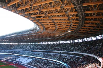 こけら落としのサッカー天皇杯決勝で行くことができました。6万人収容の巨大スタジアムですが、周囲の光景と違和感なく溶け込んでおり、木材がふんだんに使われて、日本の伝統を強く意識していることがわかります。観客席は3層構造で、2層目から観戦しましたが、すり鉢状に傾斜がかかっており、意外と見やすかったです。スクリーンの精細さ、音響も抜群です。しかし、シートは折り畳みの安っぽいプラスチック素材で、席も狭く、何より前後幅がないので、途中で移動するのに気を使います。いいスタジアムですが、これで1500億円以上かかっているのかと思うと、費用対効果はちょっと疑問ですね・・・