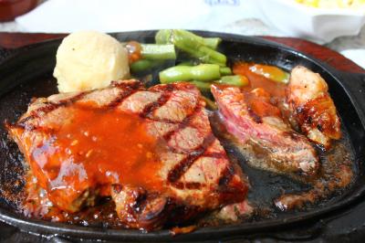 那覇においてジャッキーステーキハウスと双璧を成す由緒あるAサインのステーキ屋。最近値上げしたようで、いちばん安いニューヨークステーキ(230g)(ライス・スープ付)が2380円+税でした。牛の形をした熱々の鉄板に乗せて供されます。肉はまあ、旨いです。