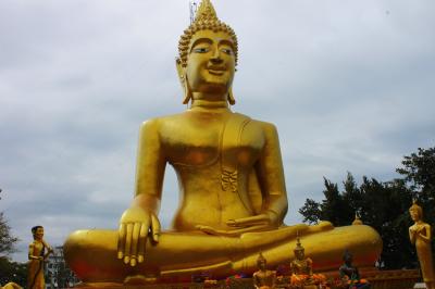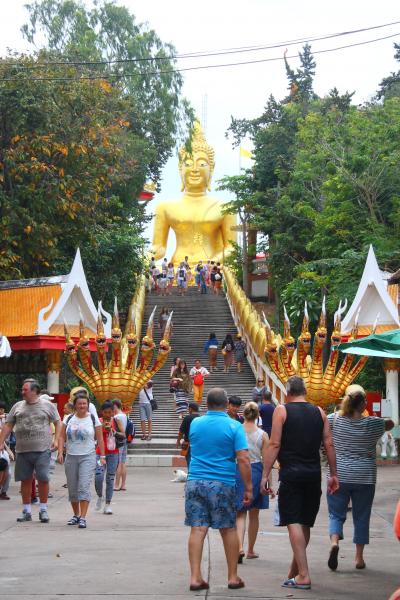パタヤ市街地後方の丘の上に建っています。セカンドロードを南へひたすら真っすぐ歩くと、途中から上り坂になり、がんばってさらに歩くと中腹に公園があります。ここは外周道路を歩かずに公園の中の遊歩道をショートカットできます。上り切ったら左手に大仏が見えているはずです。大仏の反対側(南側)歩いて10分の所に絶景のビューポイントがありますので、併せて見ることをおすすめします。
