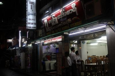 シャン地方の名物麺料理の店です。とはいっても外観、内装ともローカル食堂そのままなので気軽に入れます。場所はスーレーパゴダから歩いて約5分の34ndストリートにあり、大きく「999」と看板が出ているのですぐわかります。ローカル食堂ですが、観光客もわりと来るようで店員の対応は手馴れていて英語も少し通じます。写真入りの英語メニューがあり、汁なし麺や春巻き、豆腐などもあります。汁あり麺と春巻きを食べましたが、マイルドな味付けで普通に旨かったです。値段や300円未満。ただしビールはありません。(お茶を出してくれます。)