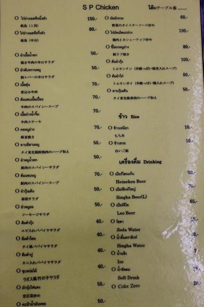旧市街ワットプラシンの南にあるイサーン料理店ですが、入口の巨大グリルで何羽ものチキンを丸ごと焼いているのですぐわかります。雰囲気はオープンエアの気取らない食堂といった感じで、入りやすいです。ここでは何をおいてもまずガイヤーンをたのむべきでしょう。ハーフサイズ80バーツ(270円)です。ここのガイヤーンはもも鶏を使う他店と違い、丸鶏をブツ切りにして出てきます。焼き立てなのでジューシーで肉の旨味が半端ないです。他のメニューもほとんど100バーツ以下です。