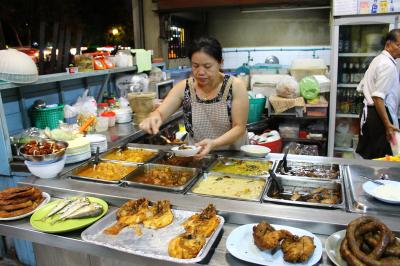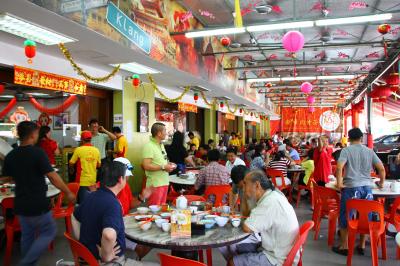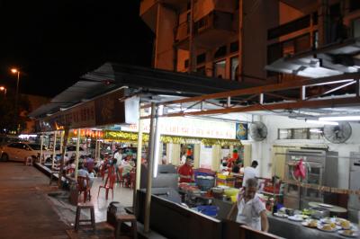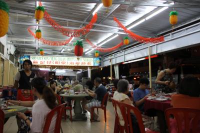 丸ごとのでかいエビソバで余りにも有名な店です。偶然入ってすすめられたのでやはりエビソバをたのみました。エビの大きさによって何種類かランクがあるようですが、いちばん安い50リンギット(1400円)をたのみました。大ぶりの殻付きエビが丸ごと1匹半入ったあんかけかたあげ焼きそばです。中華食堂なので味はまずまずです。(中華料理はまずく作るのが難しい。)雰囲気は気取らない大衆食堂で、すぐ近くの新峰肉骨茶のスペアリブたっぷりのバクテーが18リンギット(500円)であることを考えると、やはり異様に高いと言わざるを得ません。