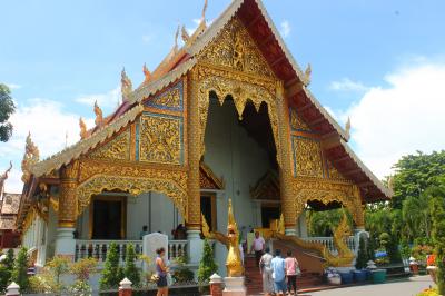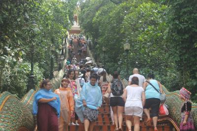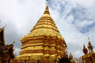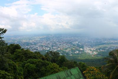 郊外の標高1000mを超す山頂にあるお寺です。行き方ですが、旧市街北のチャンプアック門まで行くと、多くのソンテウが待機しており、声をかけられます。往復100バーツ(330円)です。この方法がいちばん安くかつ手軽だと思います。山頂までは約40分。かなりの山道を登っていきます。麓から見ると山頂付近は雲に覆われていることが多かったのですが、やはり断続的に雨が降りました。カッパか傘は持参した方がよいと思います。山頂から見えるチャンマイ市街は絶景です。