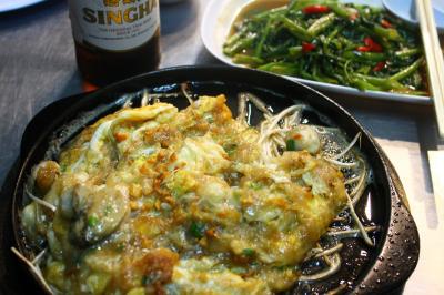 以前は古びた食堂だったようですが近年建て替えたらしく小洒落た雰囲気になっているんので誰でも抵抗なく入れると思います。カキオムレツのオースワンは200バーツ(600円)です。ここのオースワンは焼きたての鉄板ごと出てきます。小ぶりのカキがたくさん入っており、量も十分です。もちろん旨い。おすすめです。