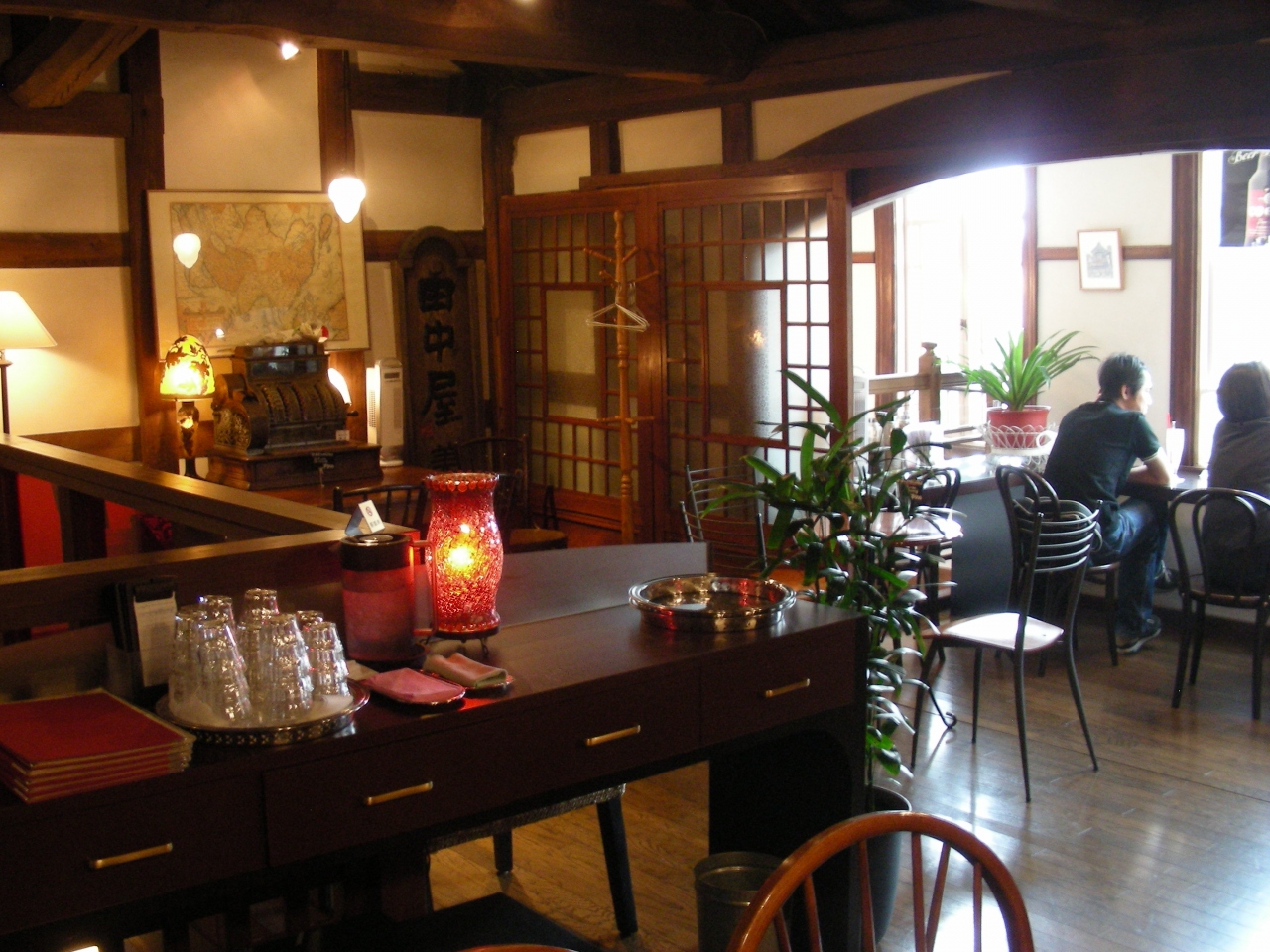 二階に上がると「どこでもお好きな所へお座りください」と言われるのですが、正面奥に見える…アレは何でしょう?アンティークのレジみたいなヤツ。あのテーブルにもメニューがおかれているので、あんな所でコーヒーを頂く事も出来るようです♪