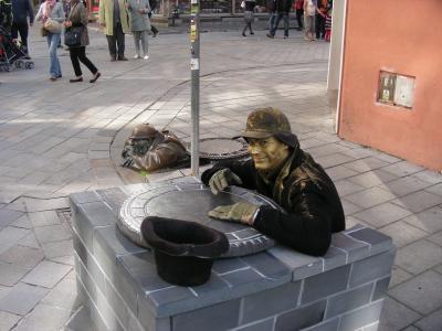 そして左折して、Panska通りに入り、フヴラネー広場のあたりをウロウロするうちに、おなじみのユーモアいっぱいの銅像や、ストリートパフォーマーに出会う事が出来ました。