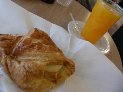 カターニアの空港でバスを待つ間、オレンジのスプレムータと総菜パンを頂きました。