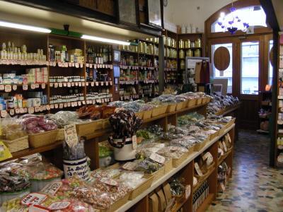 種類豊富な香辛料や、バルサミコ酢、中には小さい瓶なのに50ユーロのビンテージ?バルサミコ酢があるかと思えば、キャンディなどのお菓子も多数。その棚の裏には種類豊富な石けん、アロマグッズ!?といったお店です。