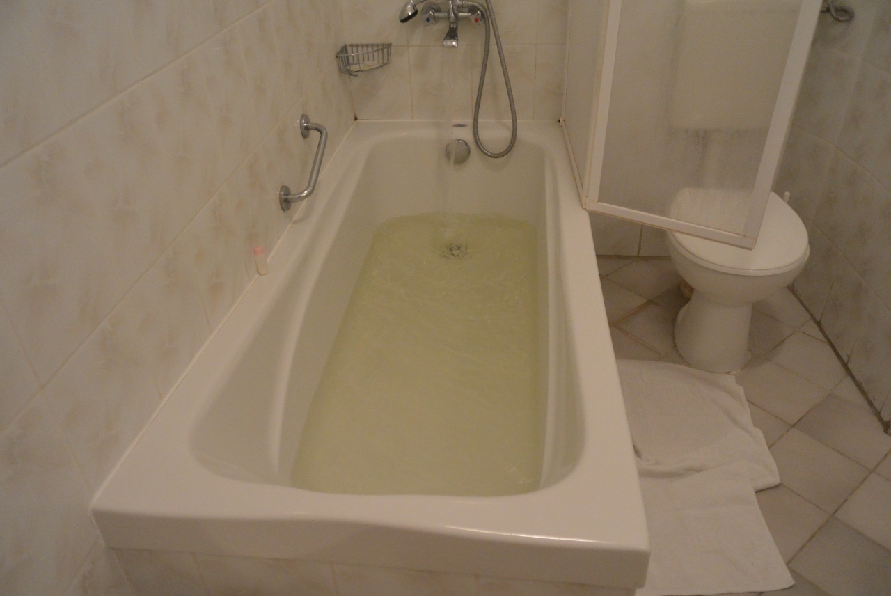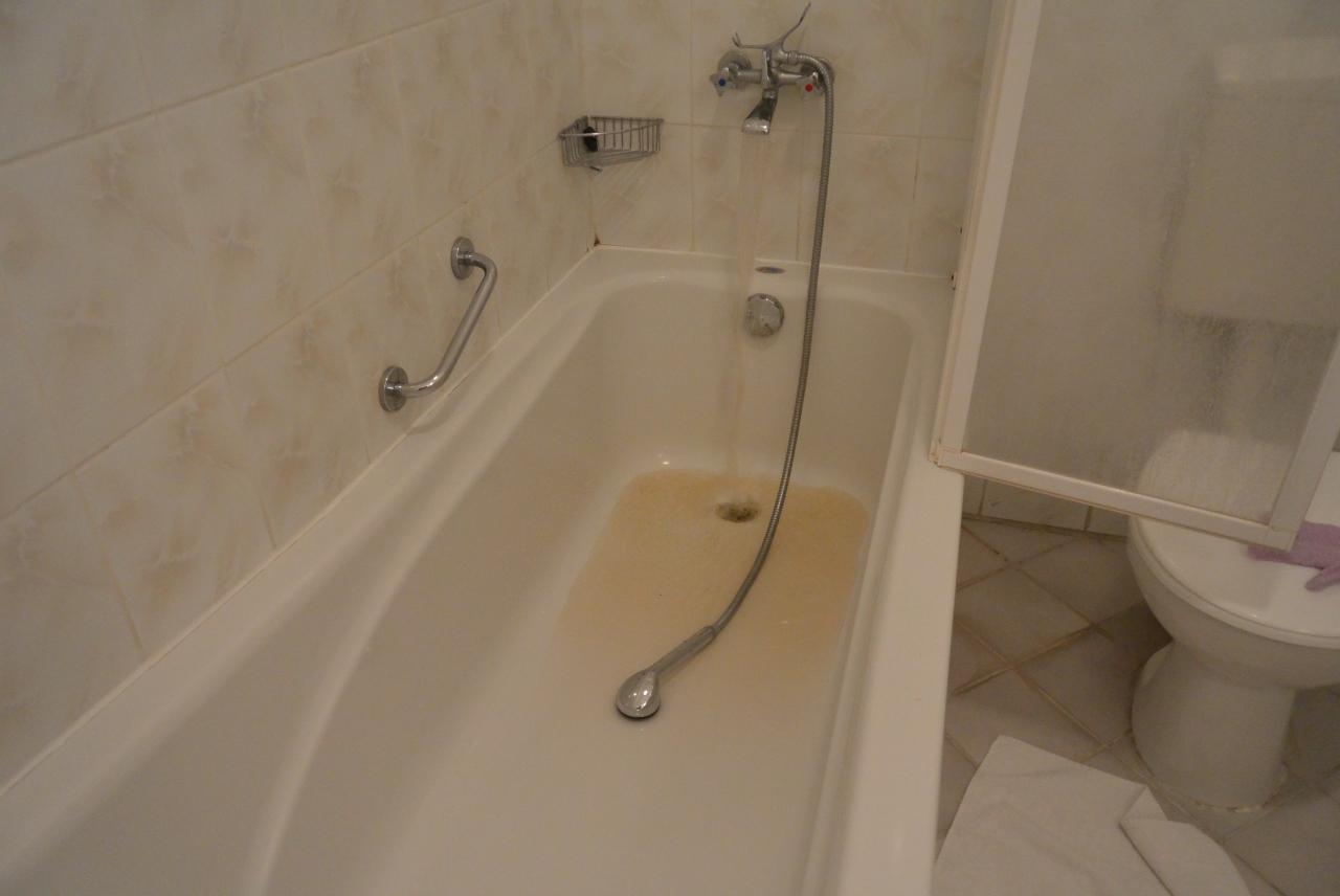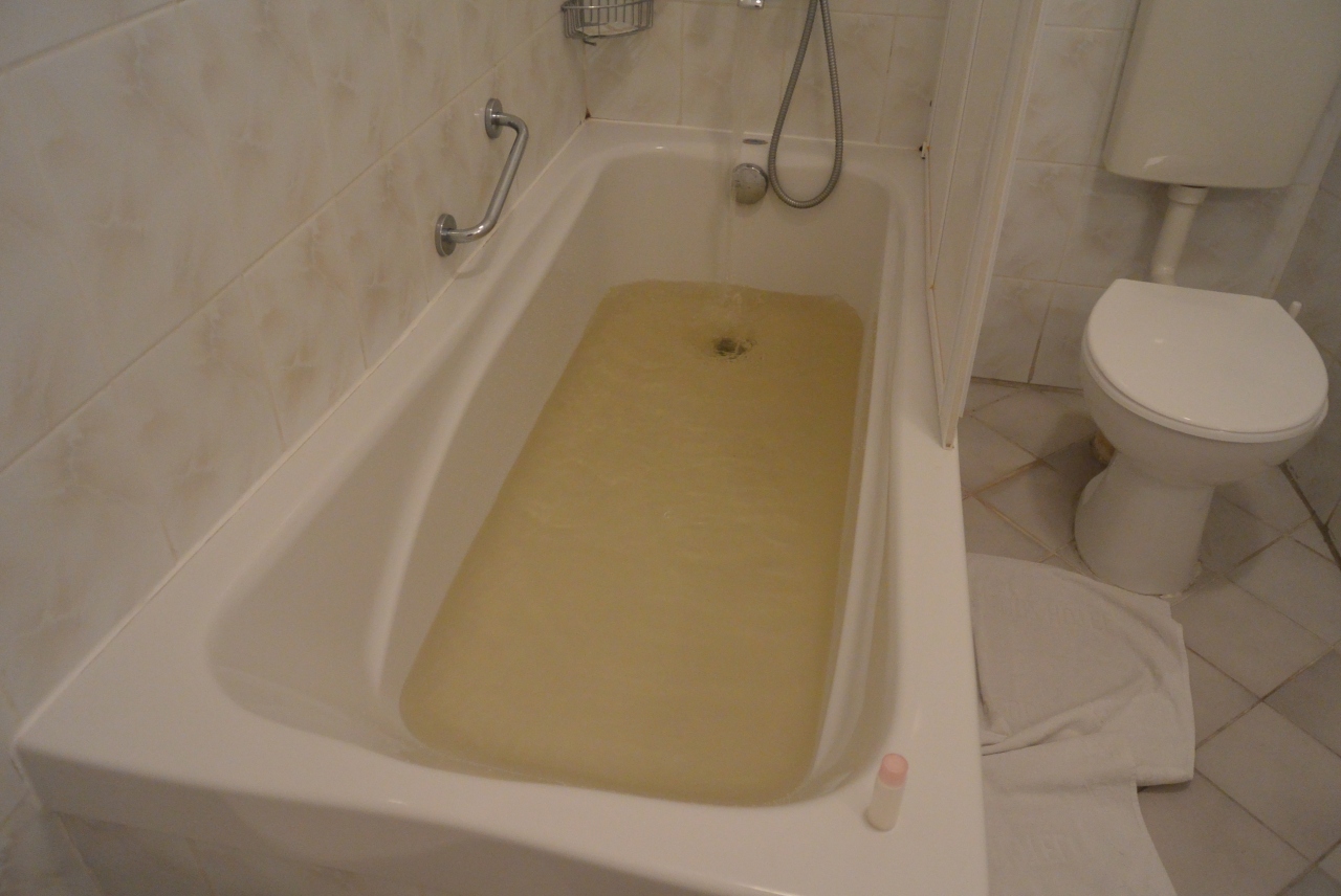 しばらく流しっぱなしにすると、だいぶ濁りは少なくなりましたが、それでもロシアの古いホテルのお湯の濁りより、濁っていました。