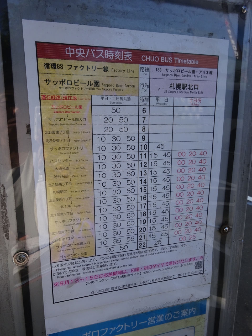 サッポロビール園(ここ)にあった巡回バスの時刻表です。(有料。普通の公共バスと同程度。というか、これは多分公共バスで、Suica可)