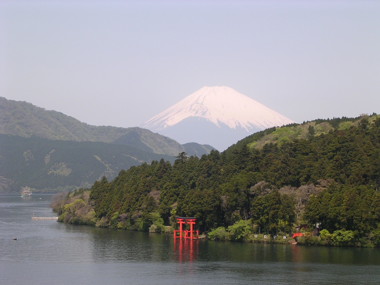 展望テラスの様な所があり、壁一面の大きな窓が額縁となって、芦ノ湖越しに富士山を眺められます。箱根神社の鳥居も見えて、素敵です。