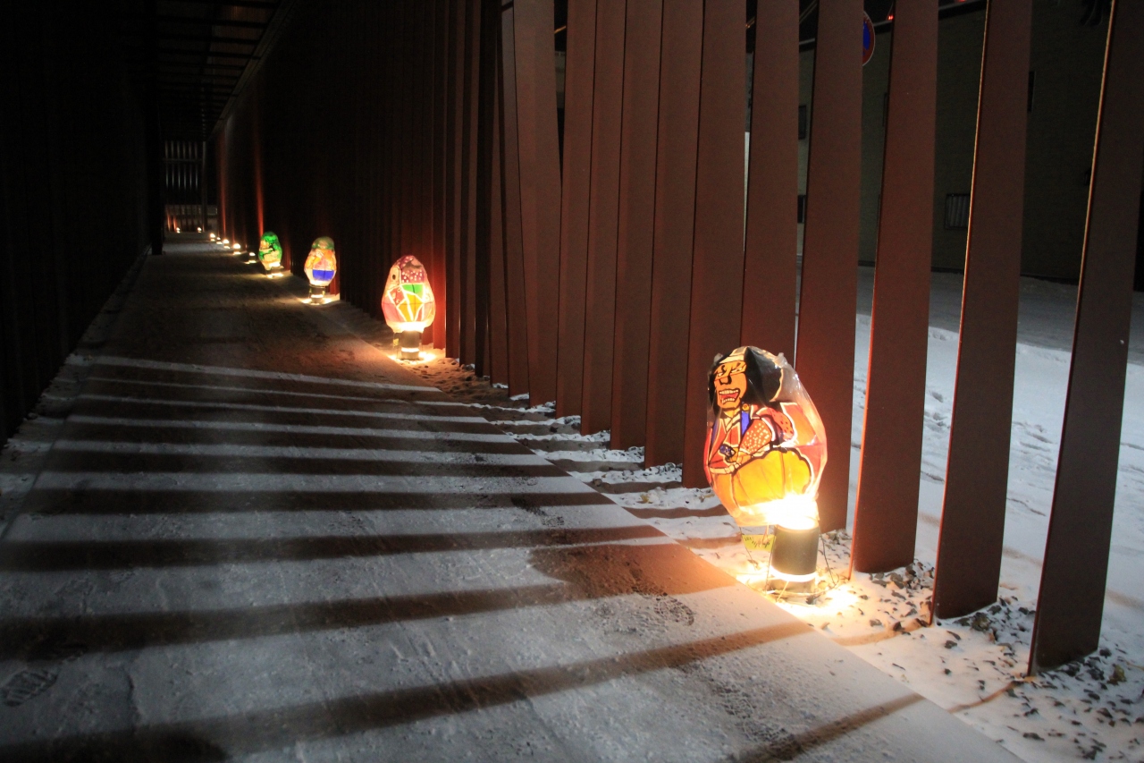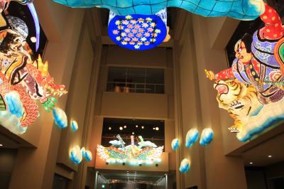 12月中旬に行きましたので、ねぶたの家 ワ ラッセの回廊にねぶたの技法でつくられた市民手作りの和紙オブジェ「雪だるま~る」が並んでいました。