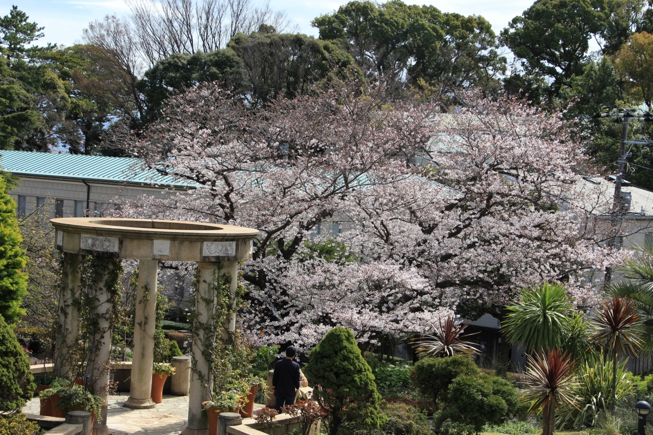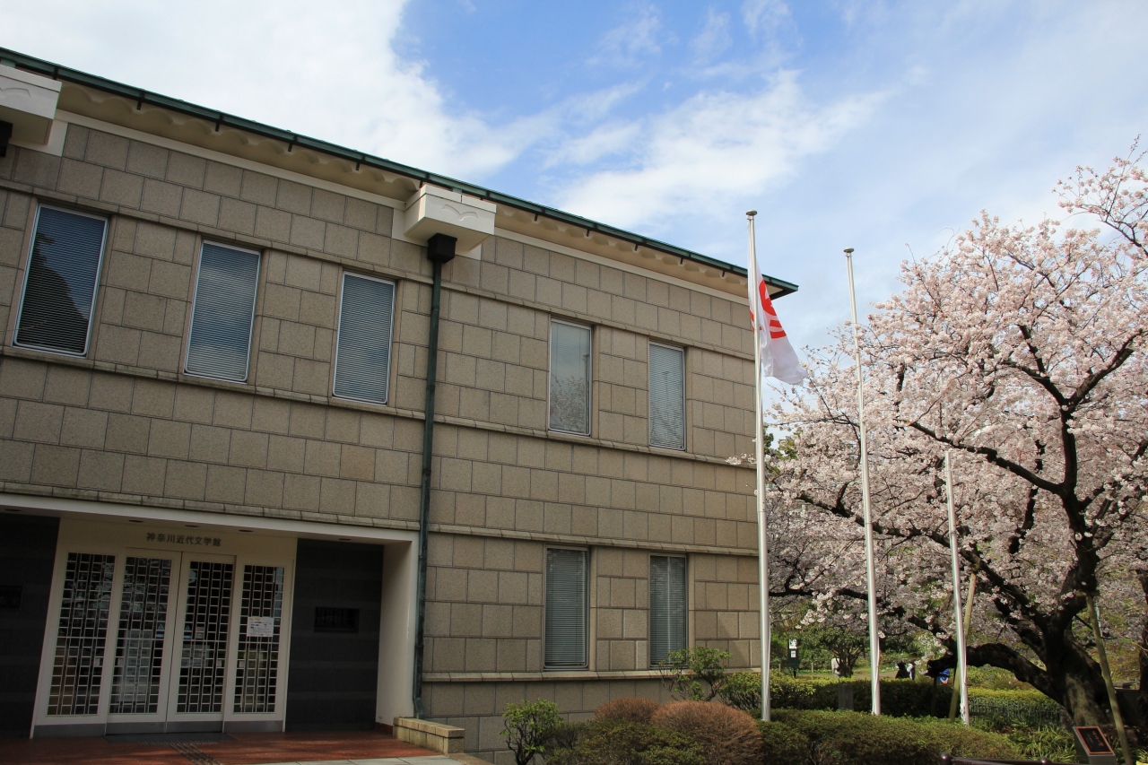 県立神奈川近代文学館は港の見える丘公園内にあります。その敷地内には「芸亭の桜」と名付けられた染井吉野と「花雪の桜」と名付けられた紅しだれが植えられています。