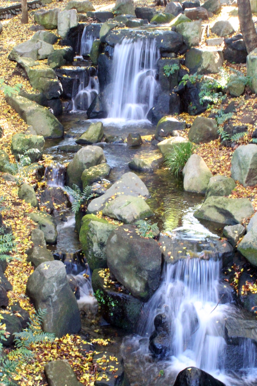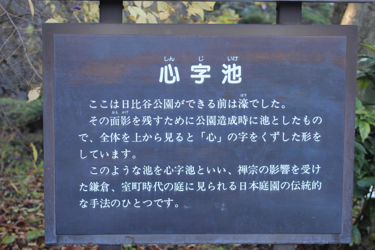 日比谷公園が出来る前は心字池のあたりは江戸城の濠だったようで、その面影を残すため池にしたそうです。上から見ると「心」の字を崩した形のようです。高台から池を見下ろすことが出来るようになっていますので確認してみては。池を見下ろすところにベンチもあります。