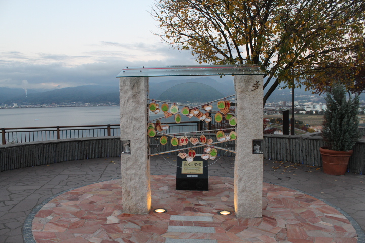 上高地からの帰路諏訪湖SAにトイレ休憩で立ち寄りました。SAに入るときモニュメントが目に留まりましたので行ってみますと「恋人の聖地」との碑があり多くの絵馬が奉納されていました。この絵馬はどこで購入されたものなのか?