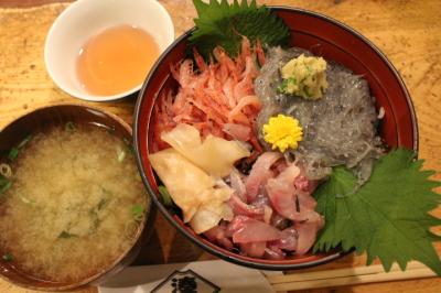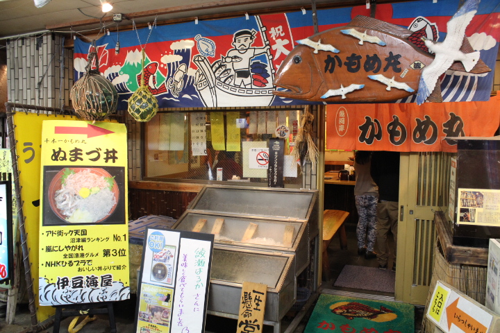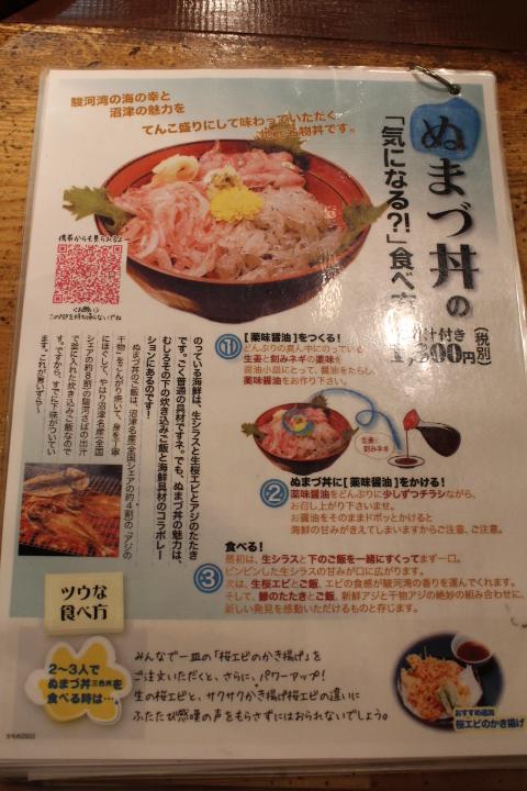 西伊豆に行く途中沼津港で昼食タイムとなり、かもめ丸に行きました。土日は10時半開店で開店と同時に入店したのでほとんど待つことなくぬまづ丼をいただきました。ぬまづ丼は鰺の干物の炊き込みご飯の上に生シラス、桜エビ、鰺が載ったどんぶりです。生姜と薬味を小皿に移し醤油をかけたものをどんぶりにかけていただきました。食べ方はテーブルに置かれているメニュー綴りに載っています。