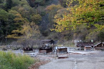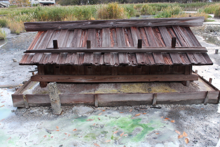 湯元温泉の源泉は温泉街の北側にあります。葦の茂湿原に小屋掛けの温泉井戸が並んでいます。小屋からは温泉の湯気が立ち込めていて辺りは硫黄の強いにおいがします。有毒なガスも発生するようで小屋の隙間窓には近付かないようにとの注意書きもあります。