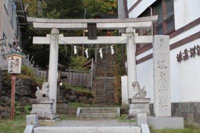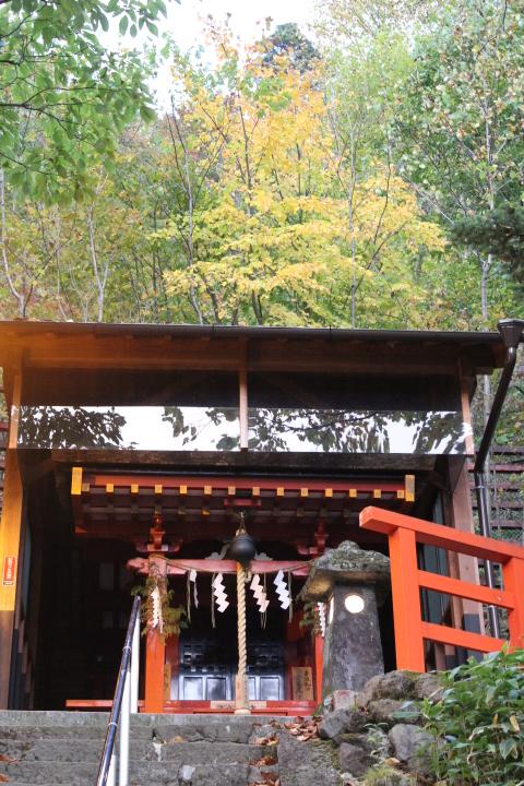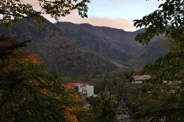 温泉神社は、湯元温泉街の東側の高台にあります。急な階段を上りきったところにあります(階段が危険なので夜間立ち入り禁止です)。温泉神社前から湯ノ湖は望めませんが、湯元温泉街を見下ろせます。夕暮れどきに行ったので夕焼け雲が綺麗でした。