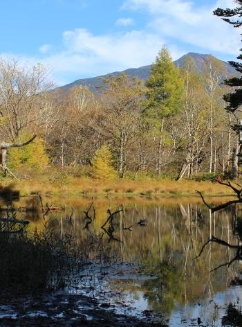 泉門池は戦場ヶ原の北端にある小さな池です。ミズナラやズミに囲まれた池のほとりにベンチがあり戦場ヶ原のハイキングの休憩地として丁度良いところです。池には鴨が泳いでおりのんびりとした雰囲気があります。池に映る紅葉も綺麗です。